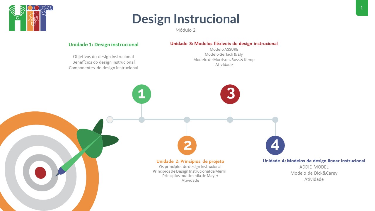 Design Instrucional: Este módulo consiste em 4 unidades, oferecendo aos professores HE STEM sugestões sobre como incluir a tecnologia instrucional no design de seus cursos, detalhando os componentes do design instrucional e seus benefícios, princípios do design instrucional, descrevendo alguns recursos instrucionais bem conhecidos. modelos e princípios de design.